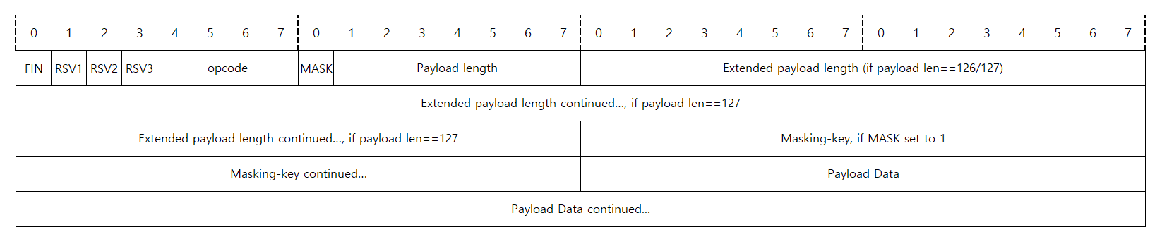 웹소켓에서 데이터가 한 번 보내질 때 그 데이터들의 묶음을 프레임(Frame)이라고 한다. 이 프레임은 아래 그림과 같은 형식으로 구성한다.