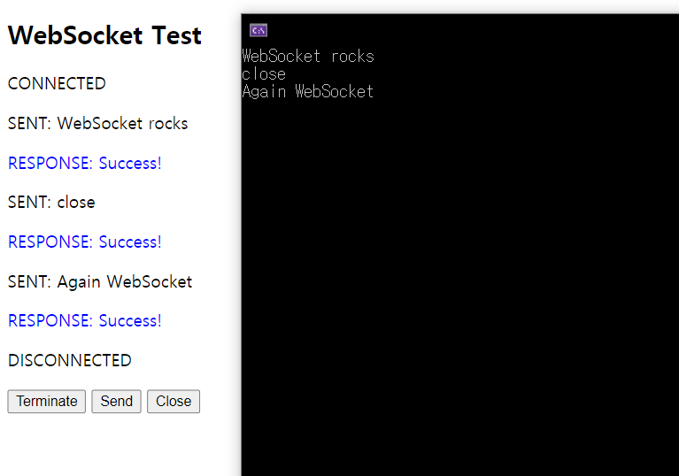 웹페이지 켜면 바로 연결과 데이터를 한 번 보내며 버튼을 누르면 데이터를 추가로 서버로 보낼 수 있다. Terminate 버튼을 누르면 연결을 종료하며 아래 그림과 같이 깔끔하게 연결이 종료되었음을 확인할 수 있다.